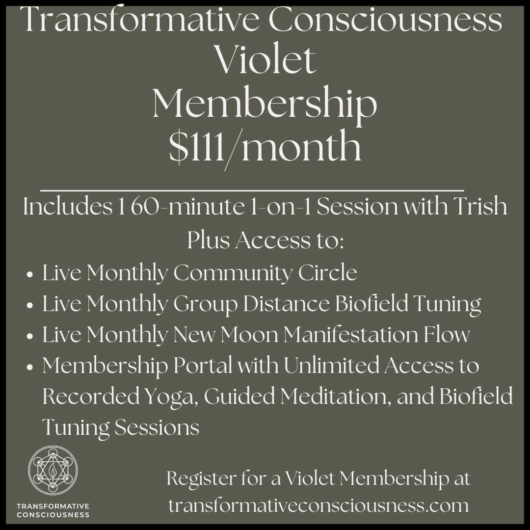 The Violet Membership gives you unlimited access to the Membership Portal, all live group events, and a standing monthly appointment for an individual 60-minute Biofield Tuning session with Trish.
