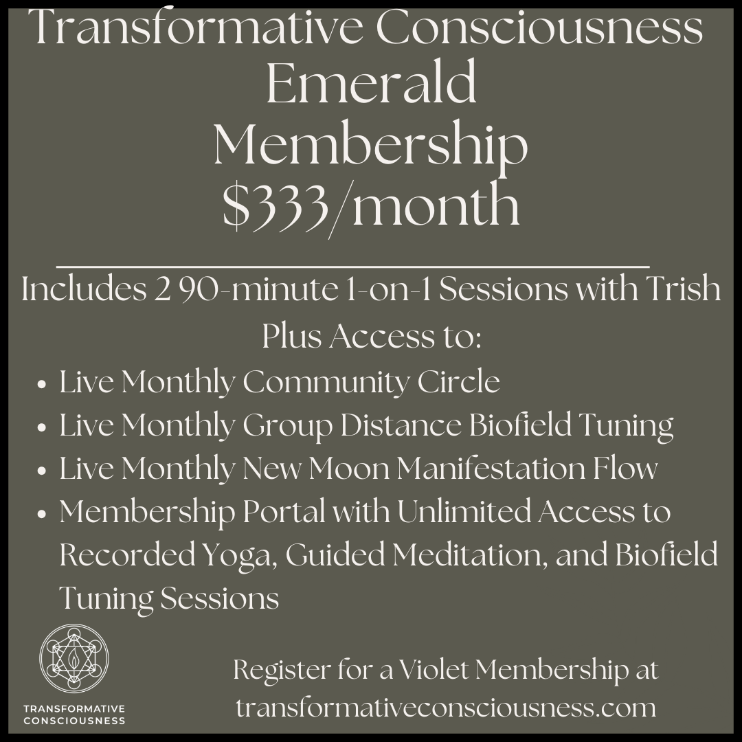 The Emerald Membership gives you unlimited access to the Membership portal, all live group events, and 2 90-minute individual sessions with Trish (Biofield Tuning or Spiritual Somatics Coaching).